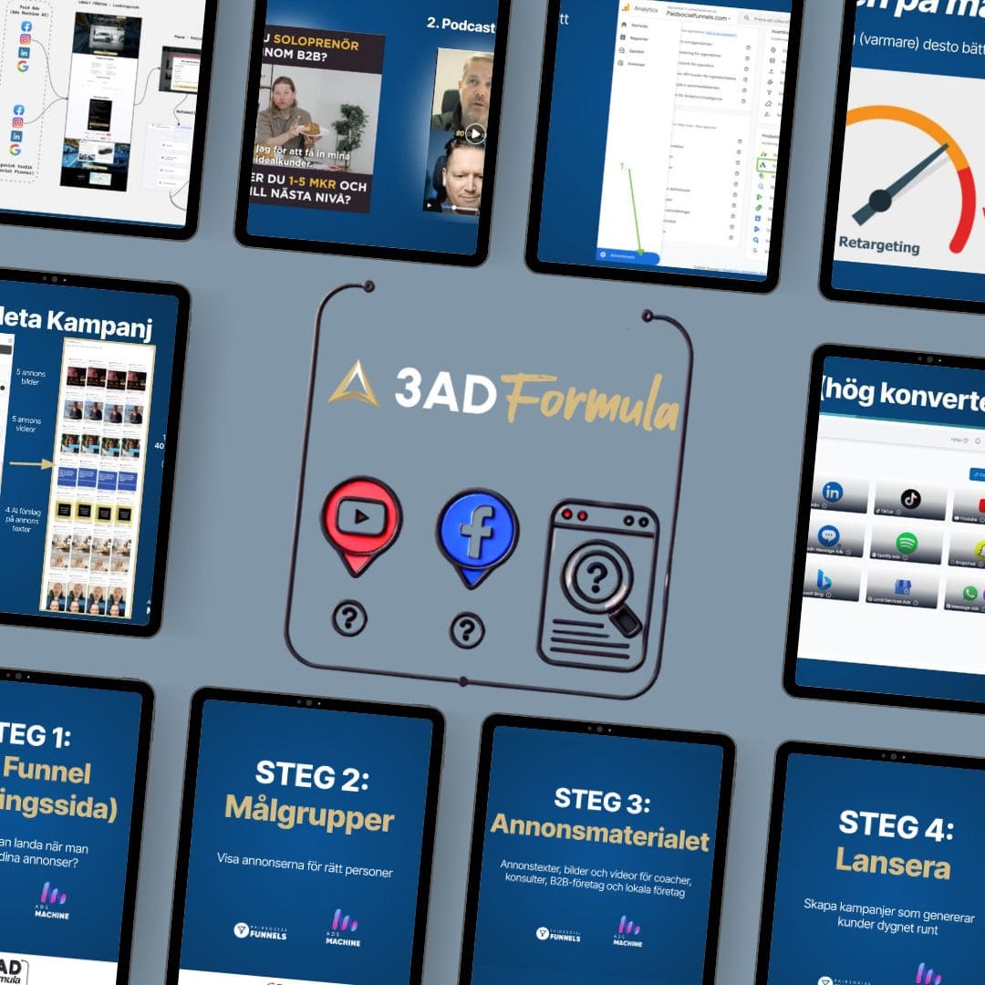 Allt jag lär ut i '3 Ad Formula' är stresstestat i den verkliga världen och fungerar för våra kunder i ALLA möjliga nischer, dock har denna kurs fokus på coacher, konsulter, B2B och lokala företag. Mao inte e-handel eftersom man där jobbar med mindre marginaler och använder inte landningssidor och funnels på samma sätt.